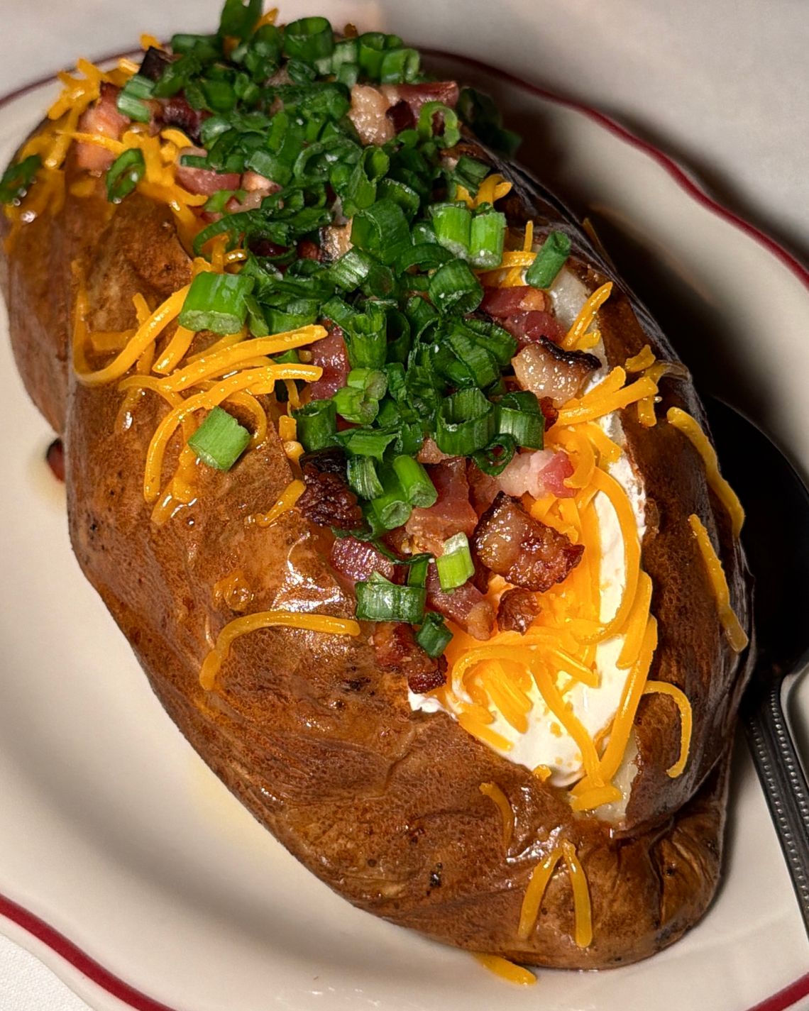 This Steer offers a full slate of steaks, all the hits. While steakhouses around town are experimenting with picanhas, rib caps, and alternative cuts, here the classicists will find filet, rib eye, two cuts of prime rib, and that shorthorn (apparently Frank’s favorite) with sauces and the usual sides. The gluey creamed spinach tasted like steakhouse heresy, but creamed corn was better and “Vegas’ Largest Baked Potato,” fully loaded with sour cream, green onions, cheese, and bacon, has to be seen to be believed: The specimen that arrived at our table was the size of a full-grown guinea pig. Hidden among these stalwarts are a few more culinarian dishes, like a fat link of beef sausage served with lentils and braised octopus nicely enlivened by chorizo.