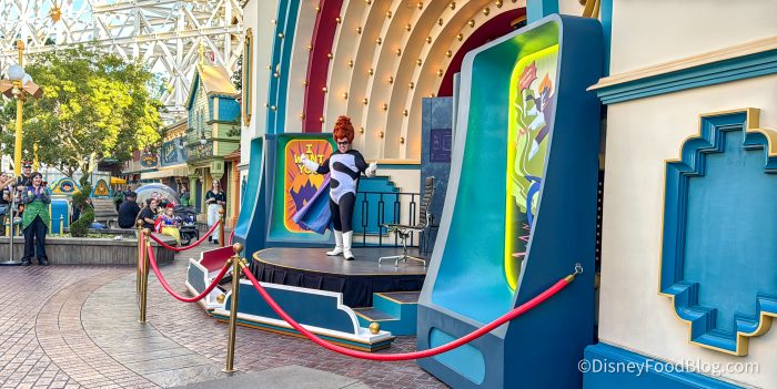 You can find Syndrome on the Syndrome Treat Trail which is near Bing Bong’s Sweet Stuff in Pixar Pier. And we definitely weren’t the only people who were excited about seeing him! After we got the chance to see him, we noticed that his line was all the way over by Goofy’s Sky School. He is quite the popular guy at Oogie Boogie Bash!